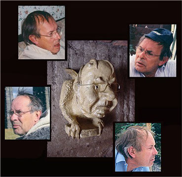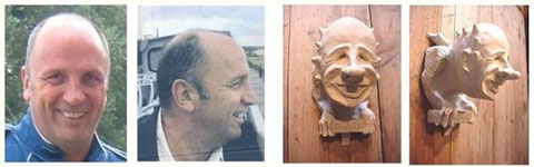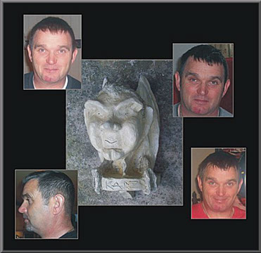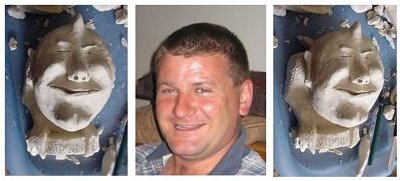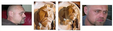 "The garage where Kim works (and which he tells me is the place where previous owners used to bury their dead pets) - is crammed with latex masks, plasticine casts and and photographs of various faces he is currently working on, and the cement finished products.